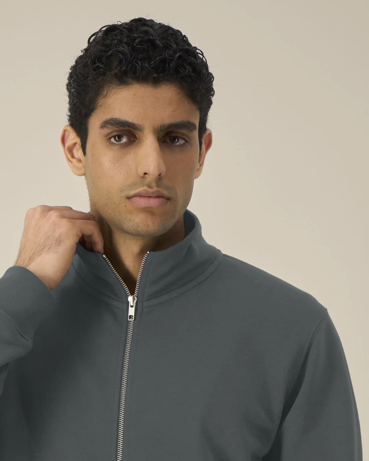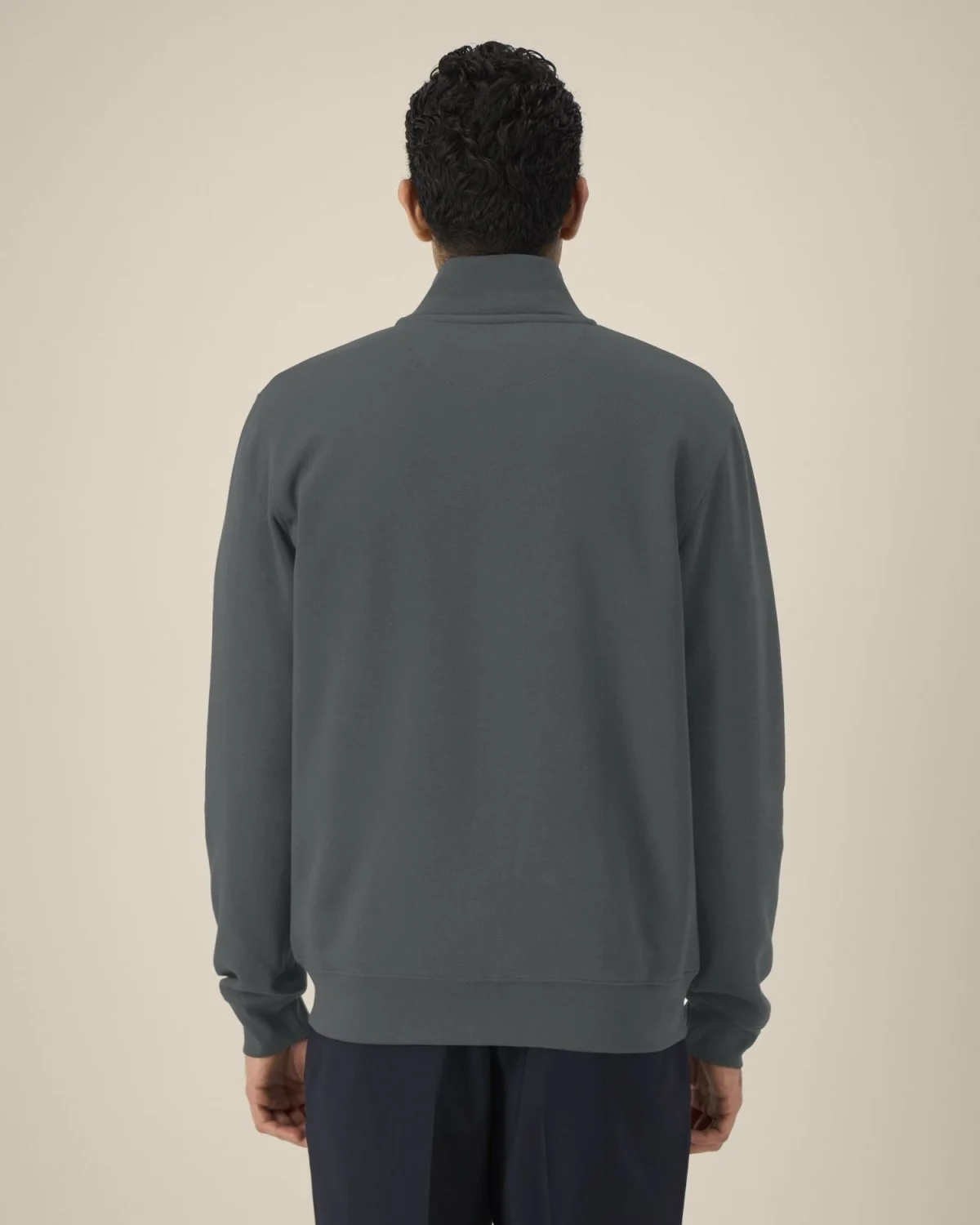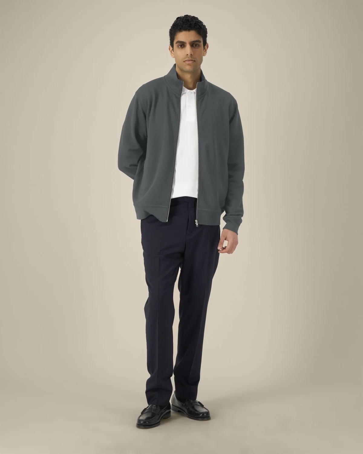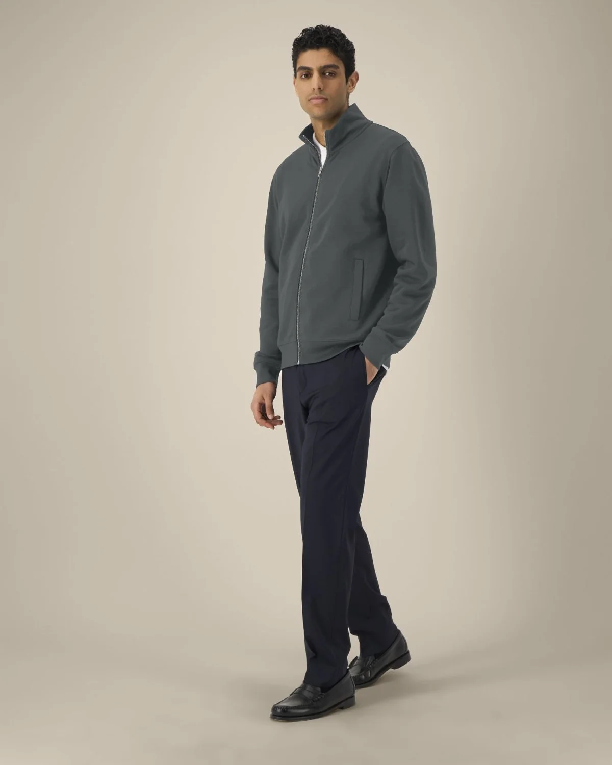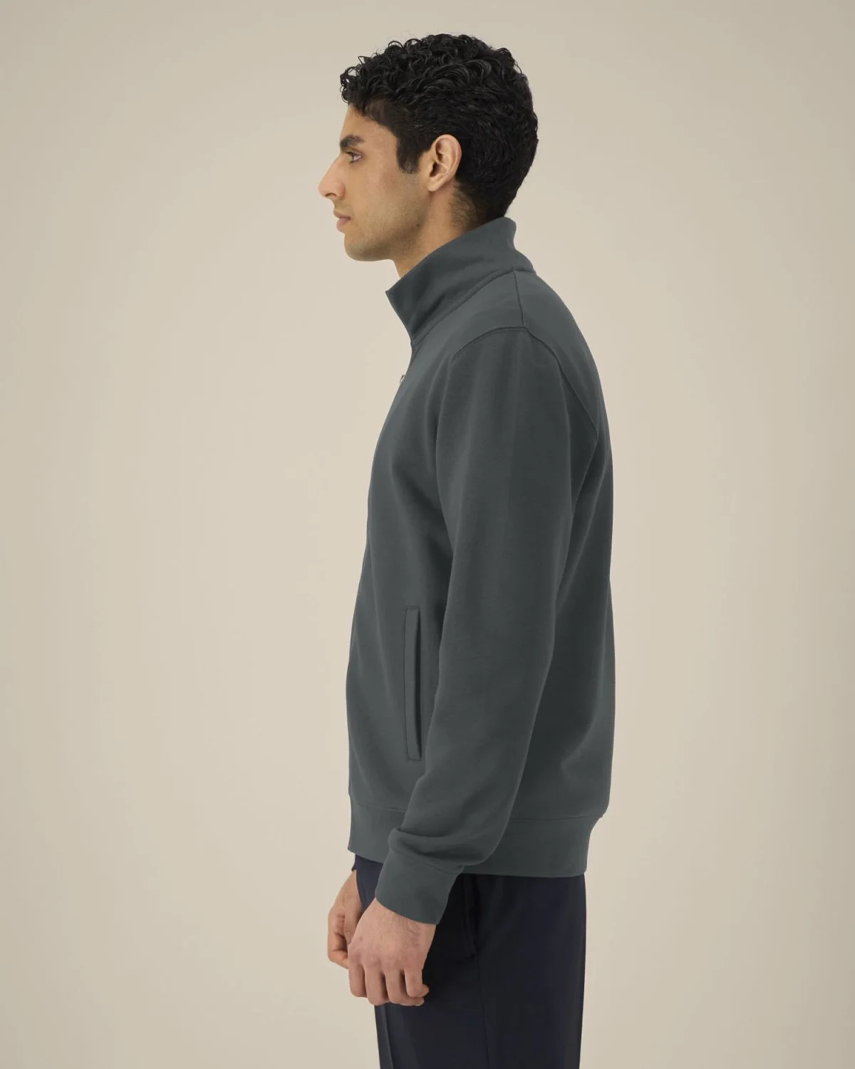 Col montant dans la matière principale Bande de propreté en chevron Demi-lune dans la matière principale au dos du col Zip métal milieu devant Manches montées Poches passepoilées Côte 1x1 au bas de manches et bas de corps