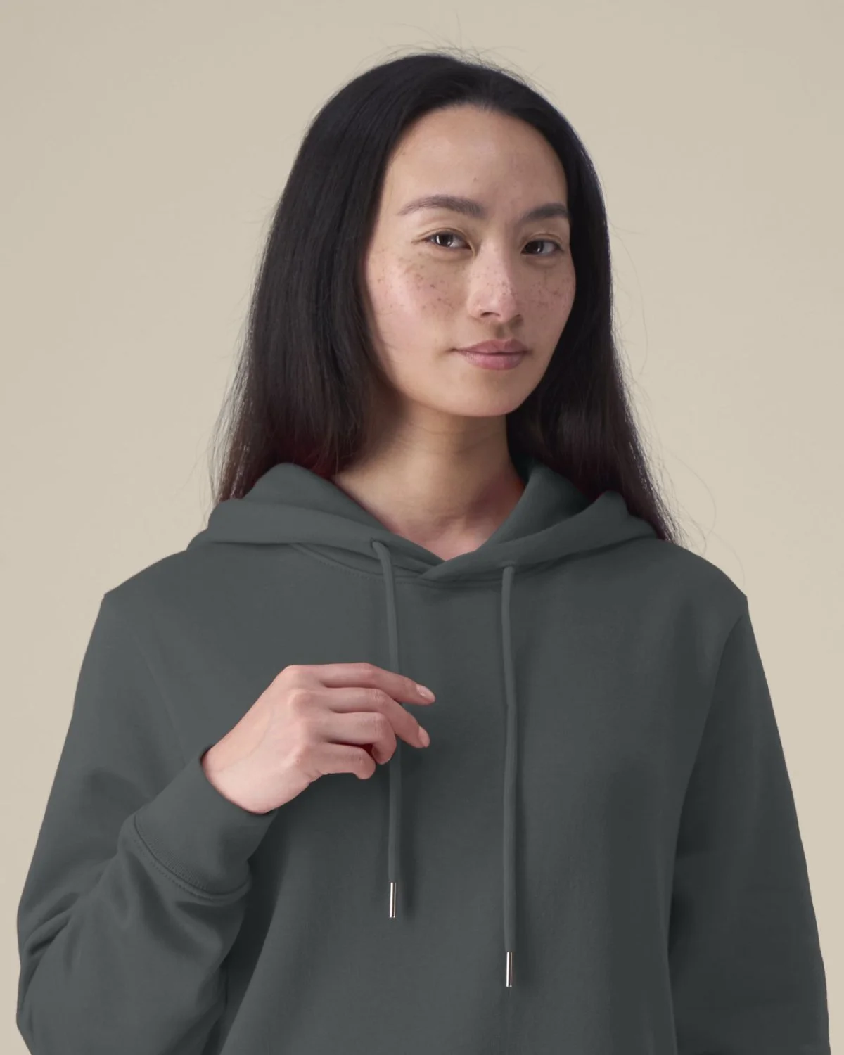 Capuche doublée dans la matière principale Cordon de serrage rond ton sur ton avec embouts en métal Embouts fabriqués à partir de 65% de métal recyclé Œillets brodés Bande de propreté en chevron Demi-lune dans la matière principale au dos du col Manches montées Poche kangourou Côte 1x1 au bas de manches et bas de corps Surpiqûre double au bas de manches et bas de corps